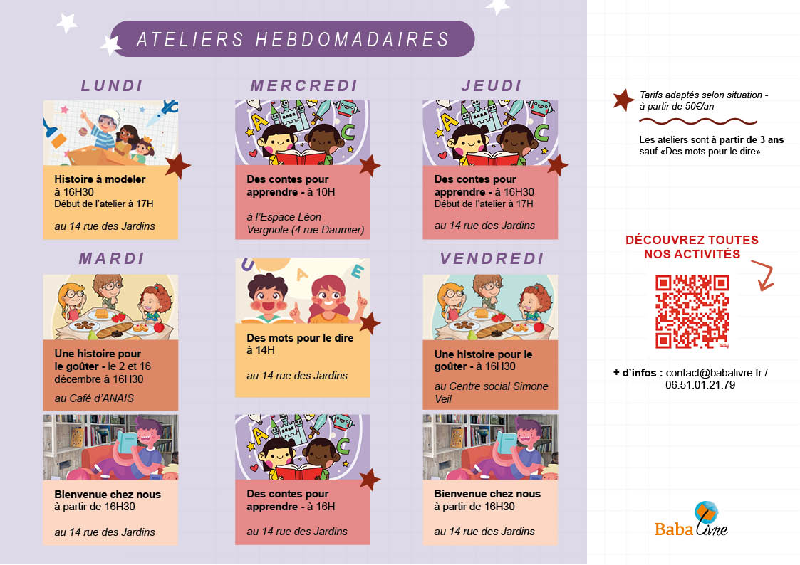 Découvrez notre planning du mois. Attention certaines animations sont sur réservation même si elles sont gratuites. Donc n’hésitez pas à nous appeler ou nous contacter par mail pour réserver vos places.